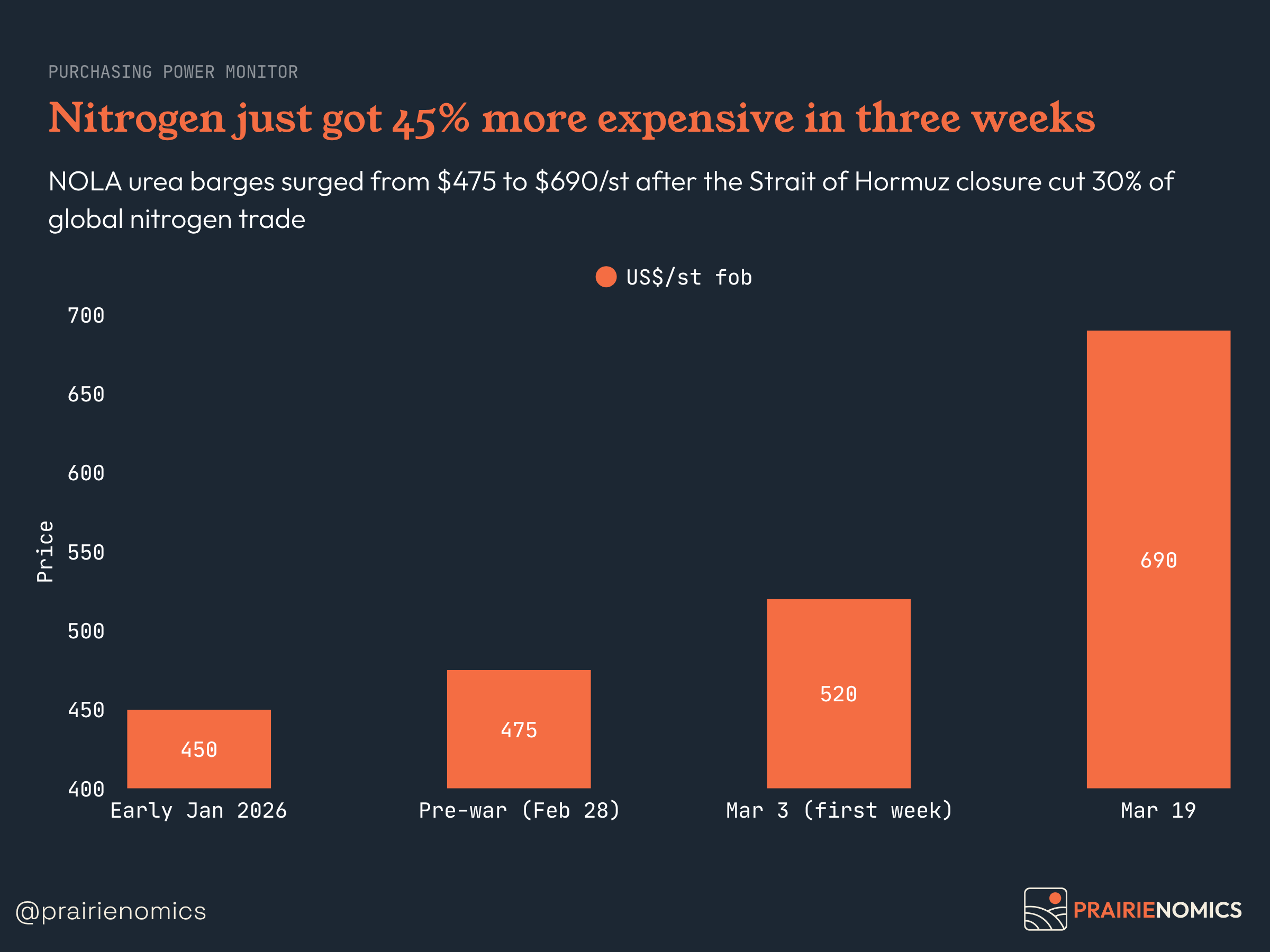 🟠 Day 27. No resolution. Fertilizer prices still climbing. Before the Strait of Hormuz closed on February 28, a barge of urea at New Orleans cost about US$475/st. Three weeks later it was past US$690. DTN's national retail anhydrous ammonia average hit US$931/ton in the third week of March, with the Illinois AMS report showing prices as high as US$998. The reason is not complicated. Roughly 30% of the world's traded urea moves through the Strait, and right now it is not moving. QatarEnergy shut down urea production entirely. China will not export until August. There is no backup supply sitting in a warehouse somewhere. A vessel that loaded in the Gulf today would not reach North American shores until mid-April, which is after most of the spring application window has closed. If you locked in nitrogen before February 28, none of this touches you. If you did not, add C$15-35/ac to your canola input budget. On 5,000 acres that is C$75,000-C$175,000 that was not in the plan a month ago.