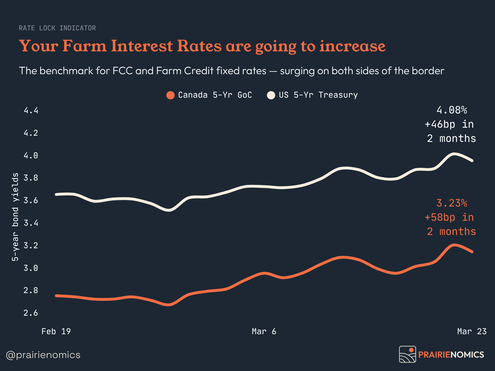 🟠 Both central banks held rates. Bond markets did not. The BoC stayed at 2.25%. The Fed stayed at 3.50-3.75%. The headlines said "no change" and moved on. But the number that actually sets your FCC fixed rate, the GoC 5-year bond yield, quietly climbed 54 basis points in a single month to 3.20%. That is the largest monthly move since early 2023, and it translates almost directly into higher fixed farm lending rates. A C$2M land loan locked in today costs roughly C$10,000/yr more than the same deal four weeks ago. A C$500K operating line converted to term, about C$2,500/yr. Macklem was unusually blunt about why the BoC is stuck: cutting rates would let energy-driven inflation run, but hiking would crush an economy that already lost 84,000 jobs in February. He warned that March CPI will show inflation rising. For the first time since 2023, markets are pricing a possible rate hike by October. The direction of the next move is genuinely uncertain, and that uncertainty is itself a cost for anyone carrying variable-rate debt.
